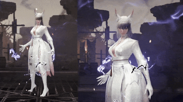 谁说白狐是妖孽,明明是祥ray!恶魔利刃的变身外观以传说中的狐妖为原型,有着白、黑、红三种颜色可以选择,毛茸茸的耳朵,配上脸部神秘的文饰,为这套变身外观更增添一份独特的风情。