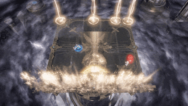 劳力埃跳回场地中央,此时冒险家们将被传送至各自的独立空间,场地四周生成多道光柱及分身,部分光柱上浮现符文。