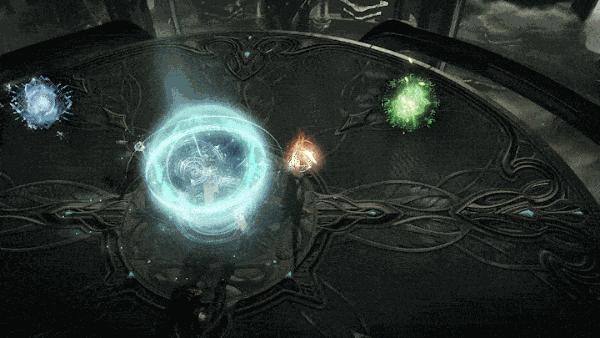 普莉娜跳回场地中央,在三个固定方向生成元素球体。同时普莉娜身上不断弥散元素光球,向元素球体移动。
